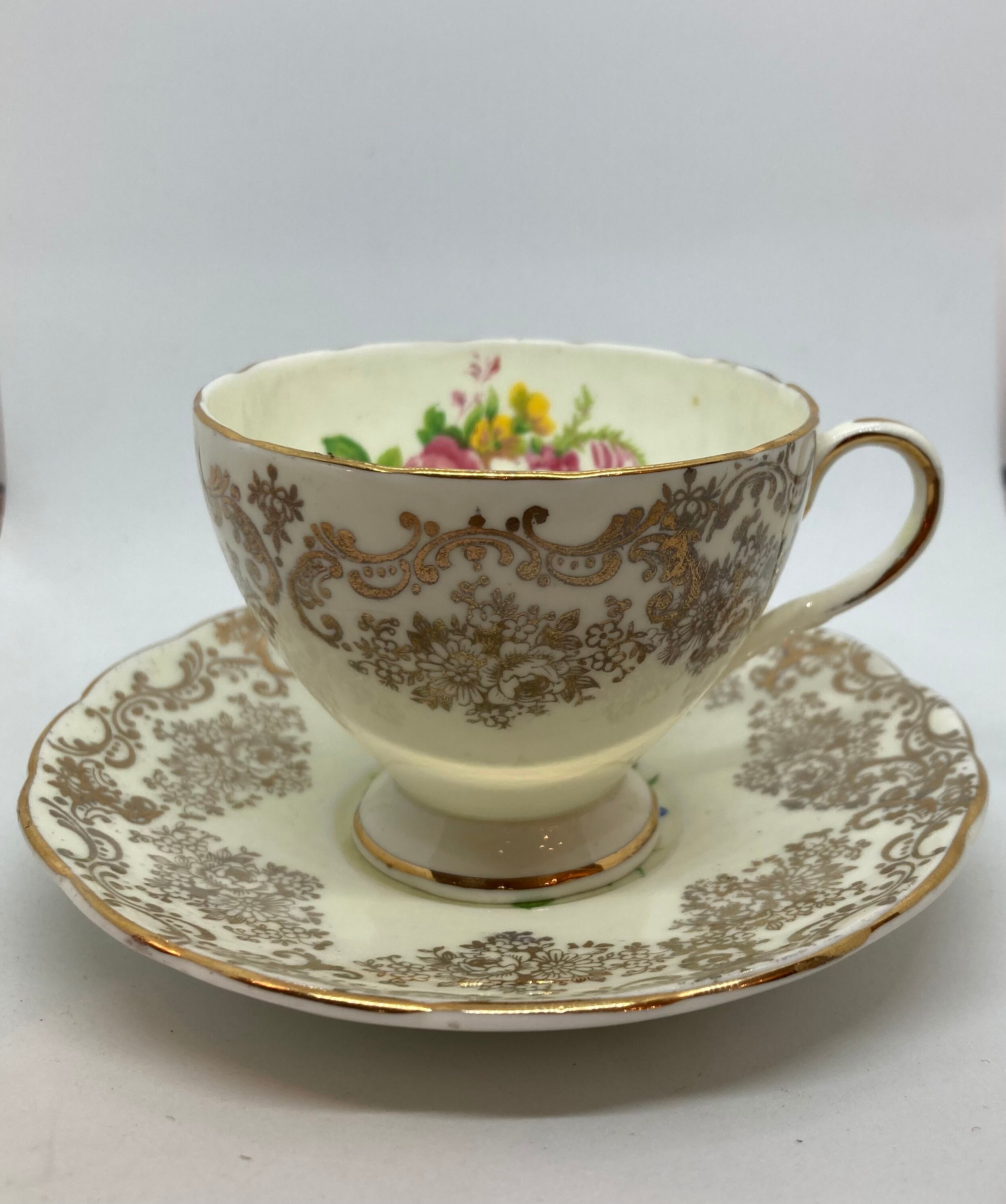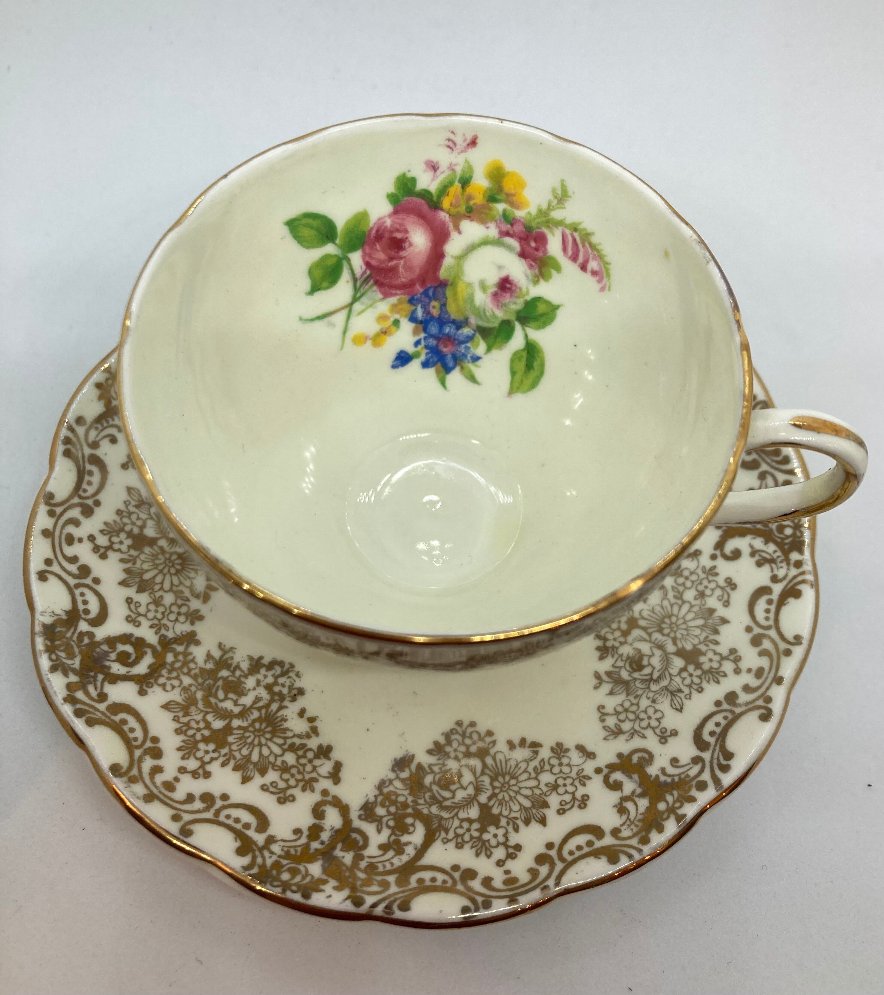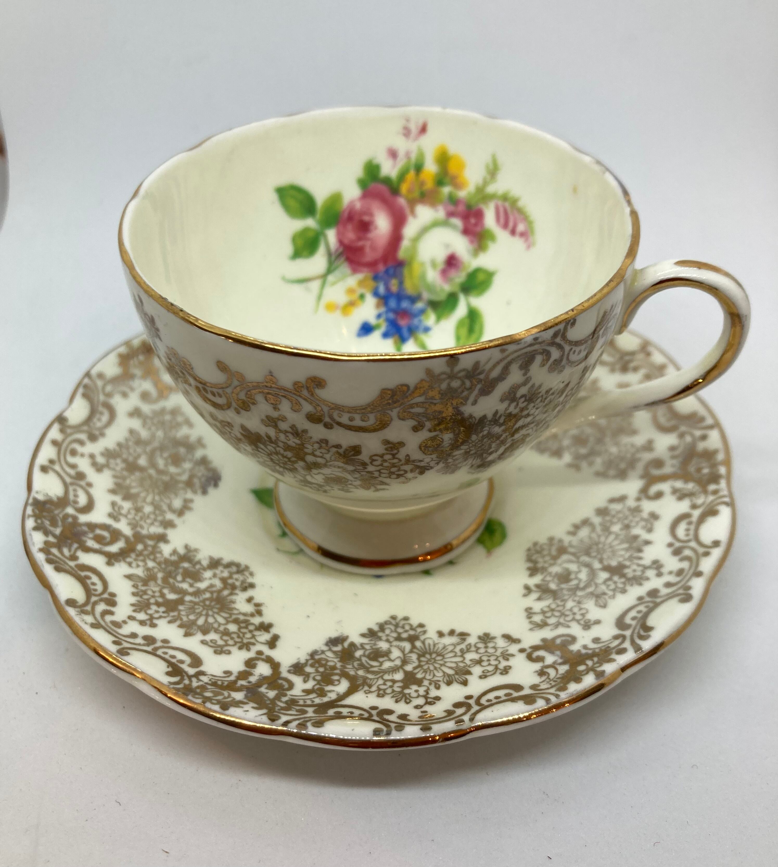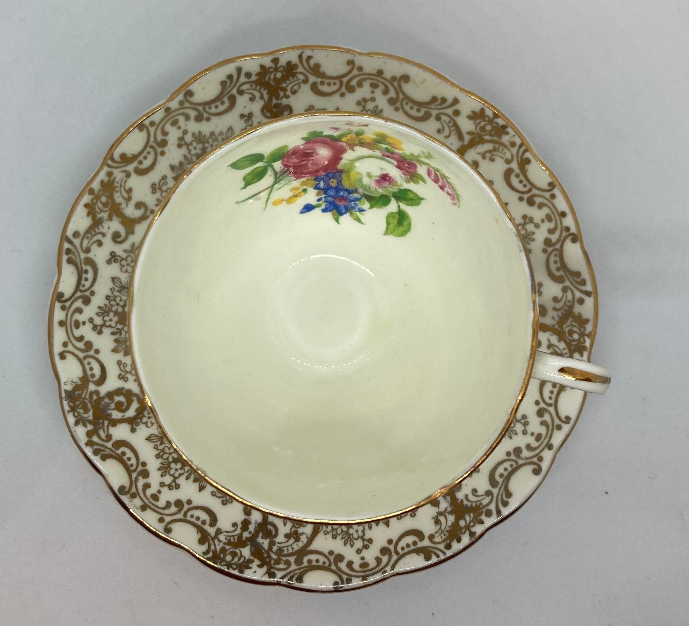 英国 FOLEY窯 チャイナボーン デミタスカップソーサーです。バラ柄がとてもチャーミングです。欠け、クラック無く金彩の状態も良好です。カップ口縁径72ミリ ソーサー径118ミリ 全体高63ミリ。